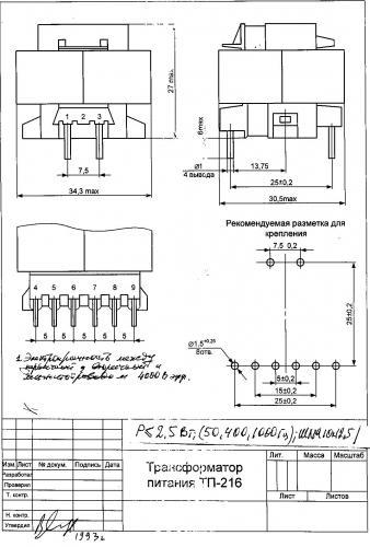 Трансформатор питания ТП-216 (2 Вт) ГОСТ 14233-84(50,400,1000 Гц)